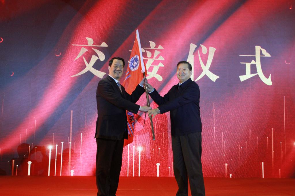 彭寿院士(左)与袁亮院士(右)进行会旗交接仪式