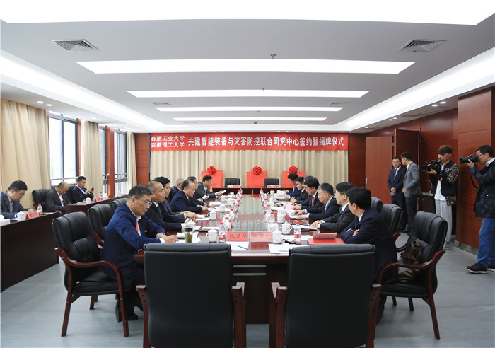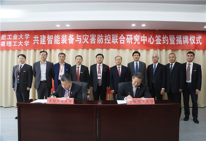 共建智能装备与灾害防控联合研究中心签约暨揭牌仪式在合肥工业大学翡翠湖校区隆重举行。合肥工业大学党委书记余其俊、校长梁樑、党委副书记陈刚、副校长郑磊,我校党委书记郭永存、校长袁亮、党委副书记虞宝桃、副校长郑明东,合肥工大高科信息科技股份有限公司董事长魏臻,合肥恒大江海泵业股份有限公司副总裁王宁等出席仪式。余其俊主持仪式。