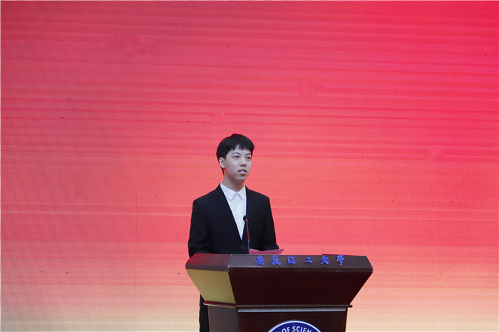学生代表、2017级自动化专业王昊男同学发言。他说,作为新一代的安理人,将树立与中国梦同心同向的理想信念、与安理梦同心同行的奋斗目标,把个人梦融入安理梦、民族梦,为昨天的安理自豪,为今天的安理赋能,为明天的安理喝彩,在实现中国梦的生动实践中书写无愧于时代的青春华章!